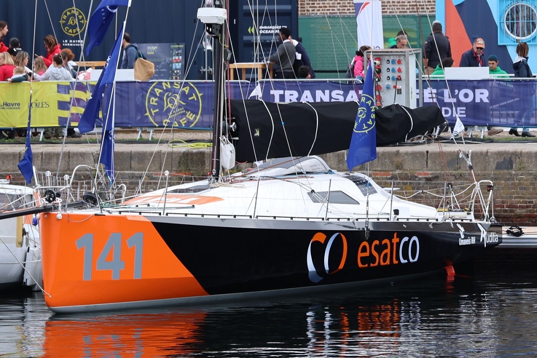 A cinq jours du départ de la Transat Café L’Or (ex-Transat Jacques Vabre), le Class40 esatco barré par Nicolas Guibal et Gauthier Bril a été baptisé par son parrain, Damien Seguin.